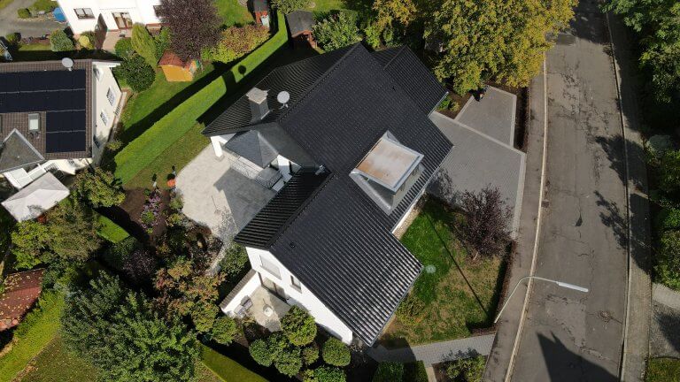 Selbst dreidimensionale Formen können optimal mit dem beständigen Naturmaterial gedeckt werden. Deshalb haben sich die Bauherren des Objekts im Oberbergischen Kreis erneut für Schiefer auf ihrem Dach entschieden – einerseits der Funktionalität und andererseits der Optik wegen.